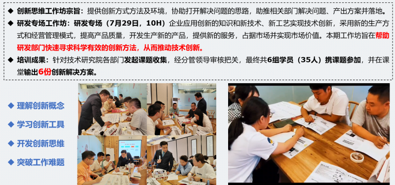 對于創新來說,方法就是新的世界,最重要的不是知識,而是思路。企業應用創新的知識和新技術、新工藝實現技術創新,采用新的生產方式和經營管理模式,提高產品質量,開發生產新的產品,提供新的服務,占據市場并實現市場價值。為幫助核心部門快速尋求科學有效的創新方法,從而推動技術創新,創新力學院根據不同主題開展創新思維工作坊。